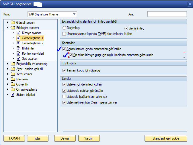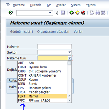 Malzeme türlerinin aşağıdaki gibi anahtarları SAP’ye ilk girişinizde kapalı gelir. Anahtarları görüntülemek için 1 numaralı ikon tıklanır ve seçenekler seçilir.