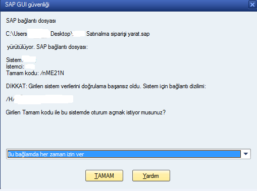 Eğer hiçbir SAP sayfası açık değilse size parola sorar. Ama herhangi bir SAP sayfası açıksa şifre sormadan ME21N işlemi açacaktır.