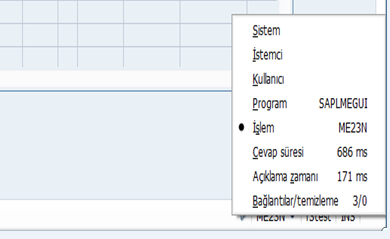 Bütün SAP ekranlarının sağ alt köşesinde bulunan bilgi bölümü birden fazla bilgiyi kullanıcıya gösterir. 1 nolu ikona tıklarsanız bu bilgiler kapanır, kapalıyken basarsanız açılır. 2 nolu yerde görünen bilgi tercihinize göre değişir. Benim tercihim hangi işlem kodunda olduğumu göstermesi.