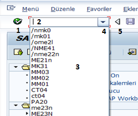Komut alanı(2 nolu yer) SAP komutlarını yazdığımız alandır. Bu alana örneğin; MM01 yazıp 1 nolu ikona veya entera basarsanız sizi malzeme yaratma ekranına götürür. 4 nolu ikona basarsanız size komut alanına girdiğiniz son 15 girdinizi (3 nolu yer) gösterir. İmleci komut alanına konumlandırıp klavyedeki aşağı yukarı tuşlarını kullanarak da son 15 girdinizi sırasıyla görebilirsiniz. 5 nolu ikon ile komut alanını kapatıp açabilirsiniz.