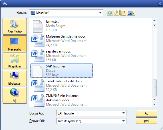Daha sonra Favorileri taşıyacağınız SAP sistemini açın ve ilk görüntüdeki gibi “Favoriler”den “PC’den yukarı yükle”ye tıklayın. Aşağıdaki ekrandan az önce isimlendirdiğiniz favorileri seçip “Aç” a basın.